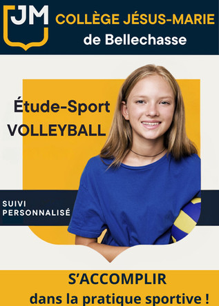 L'étude-sport volleyball du Collège Jésus-Marie de Bellechasse vise le développement des habiletés (sportives, relationnelles, émotionnelles), de la confiance en soi et de la passion du volleyball de l'élève-athlète. Les entraîneurs/enseignants qualifiés préparent des séances variées incluant des entraînements techniques et tactiques de volleyball, de la préparation physique (conditionnement physique, prévention des blessures), de la préparation mentale, des notions de nutrition sportive, des analyses vidéos, etc.